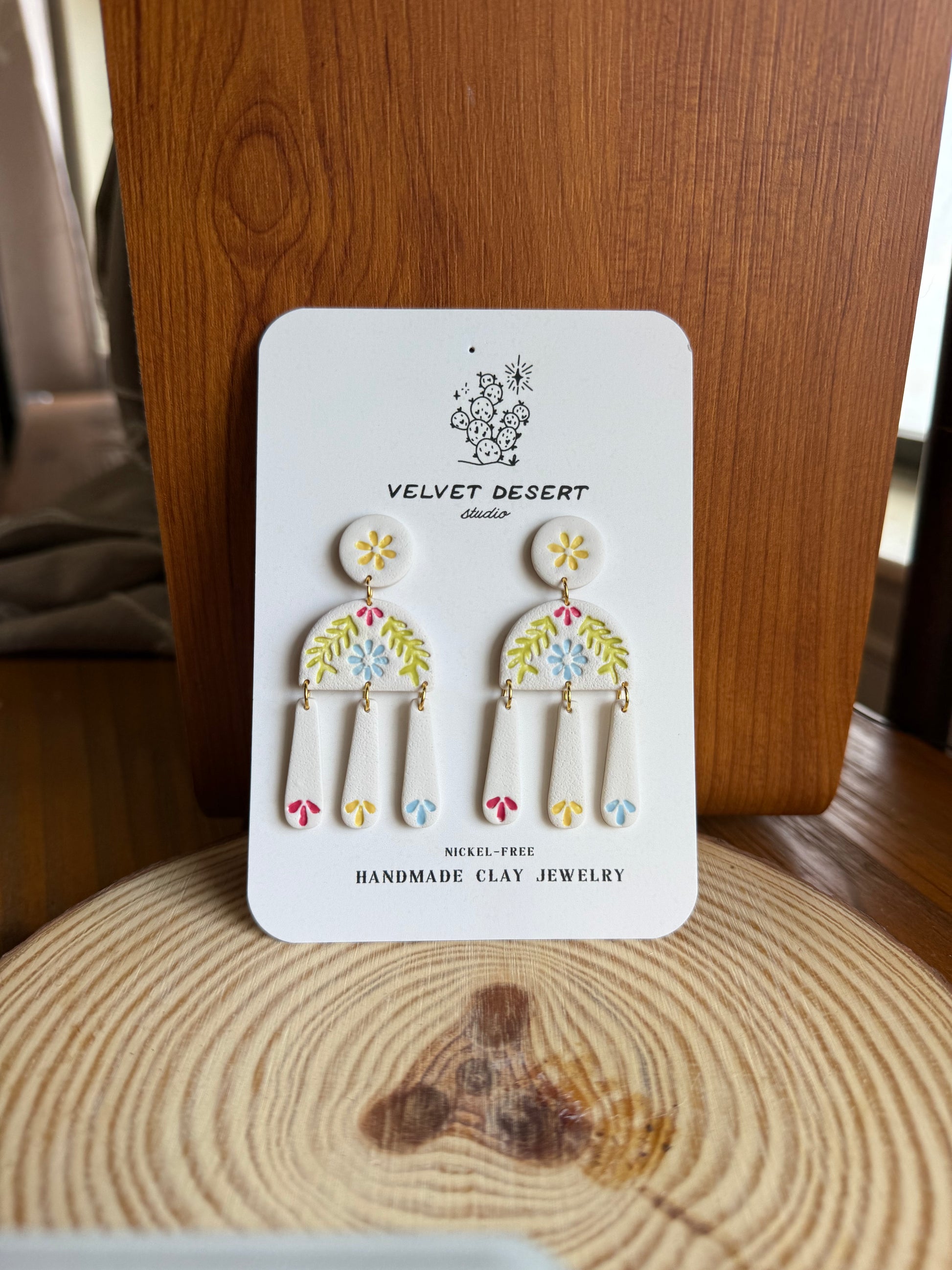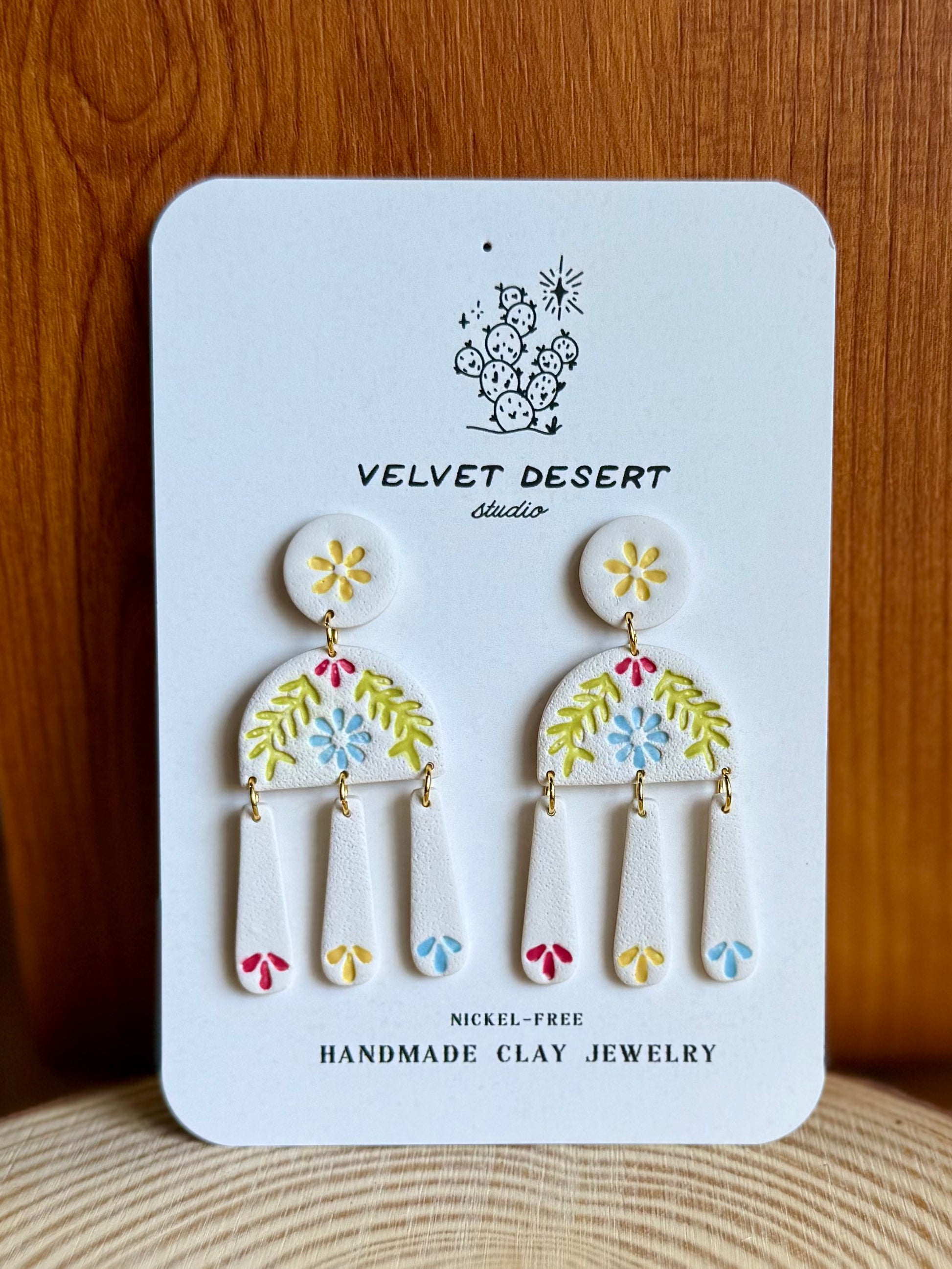 Bright blooms adorn these cream colored faux tile style dangle earrings. Inspired by bright Spanish tiles and hand-painted ceramics